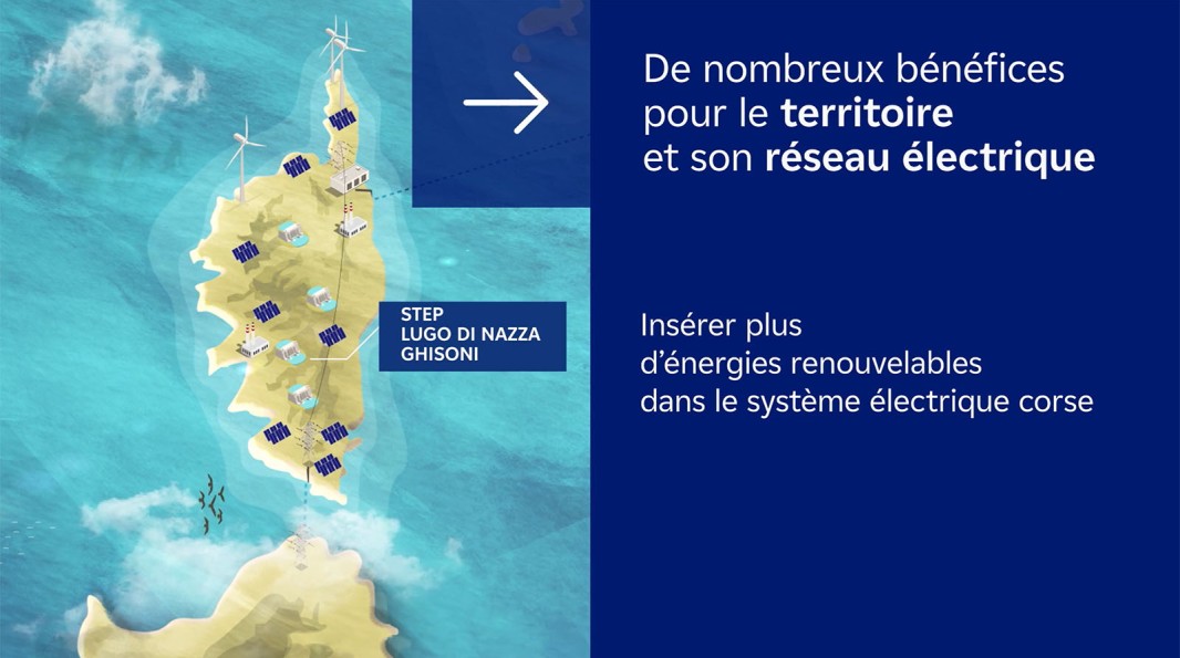 Pour y parvenir, le déploiement des énergies renouvelables (ENR) s’accompagne de solutions de stockage performantes. La Station de Transfert d’Énergie par Pompage (STEP) Lugo di Nazza - Ghisoni joue un rôle majeur dans cette stratégie. Véritable « batterie à eau », ce dispositif repose sur la réutilisation de l’eau pour stocker l’électricité produite par les ENR, puis la restituer aux moments de forte demande.