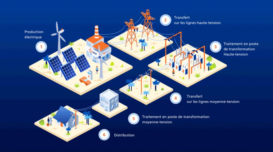 Le réseau de transport (HTB) est composé de lignes à haute tension (90kV) qui acheminent l’électricité produite par les centrales de production vers le réseau de distribution (15 ou 20 kV), proche des lieux de consommation. Le réseau de distribution est géré par EDF dans le cadre de contrats de concessions avec les Autorités Concédantes.