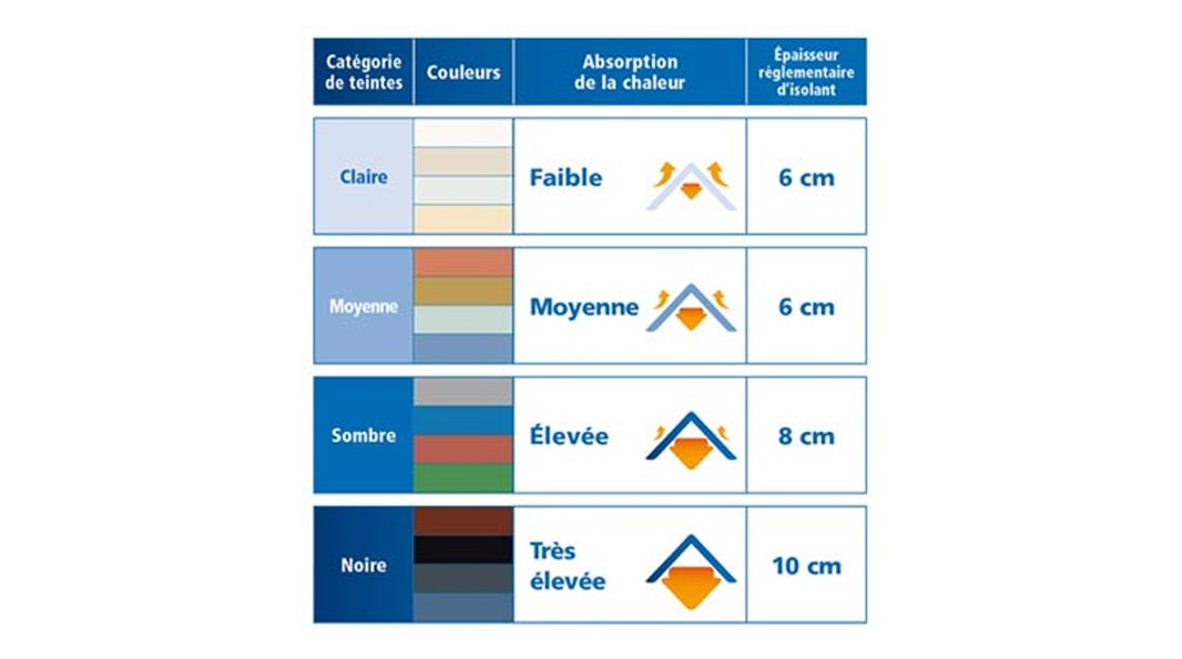 Tableau des catégories de teintes et épaisseurs d'isolant selon l'absorption de chaleur (transcription ci-après)